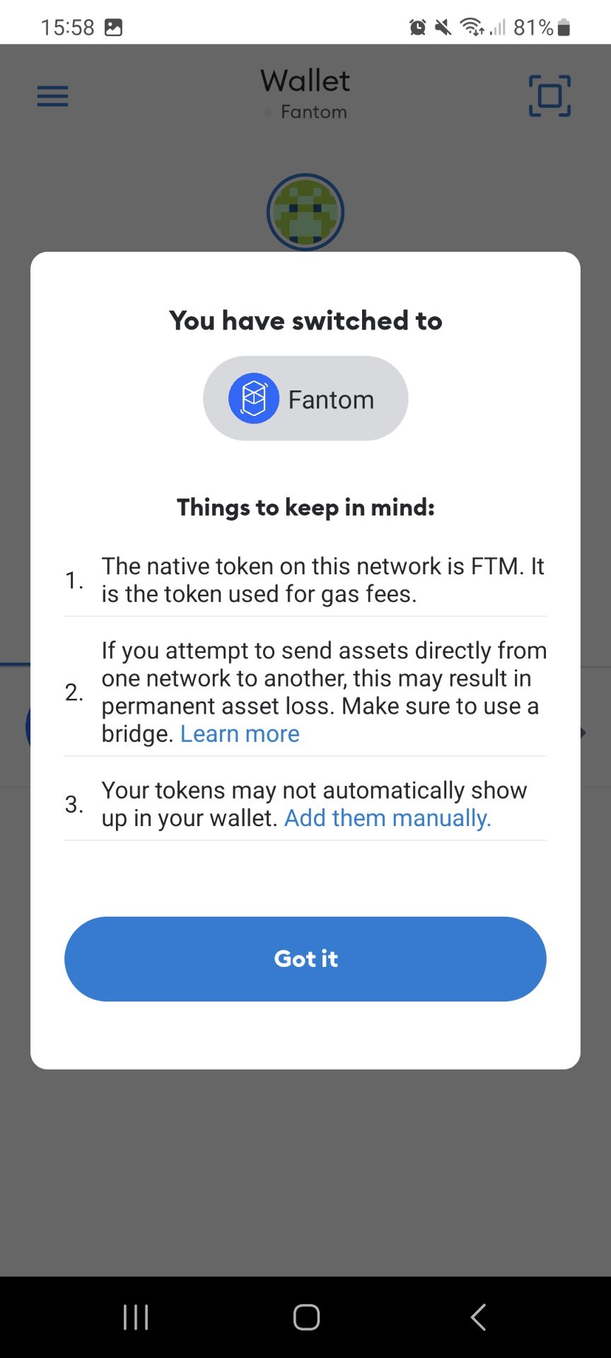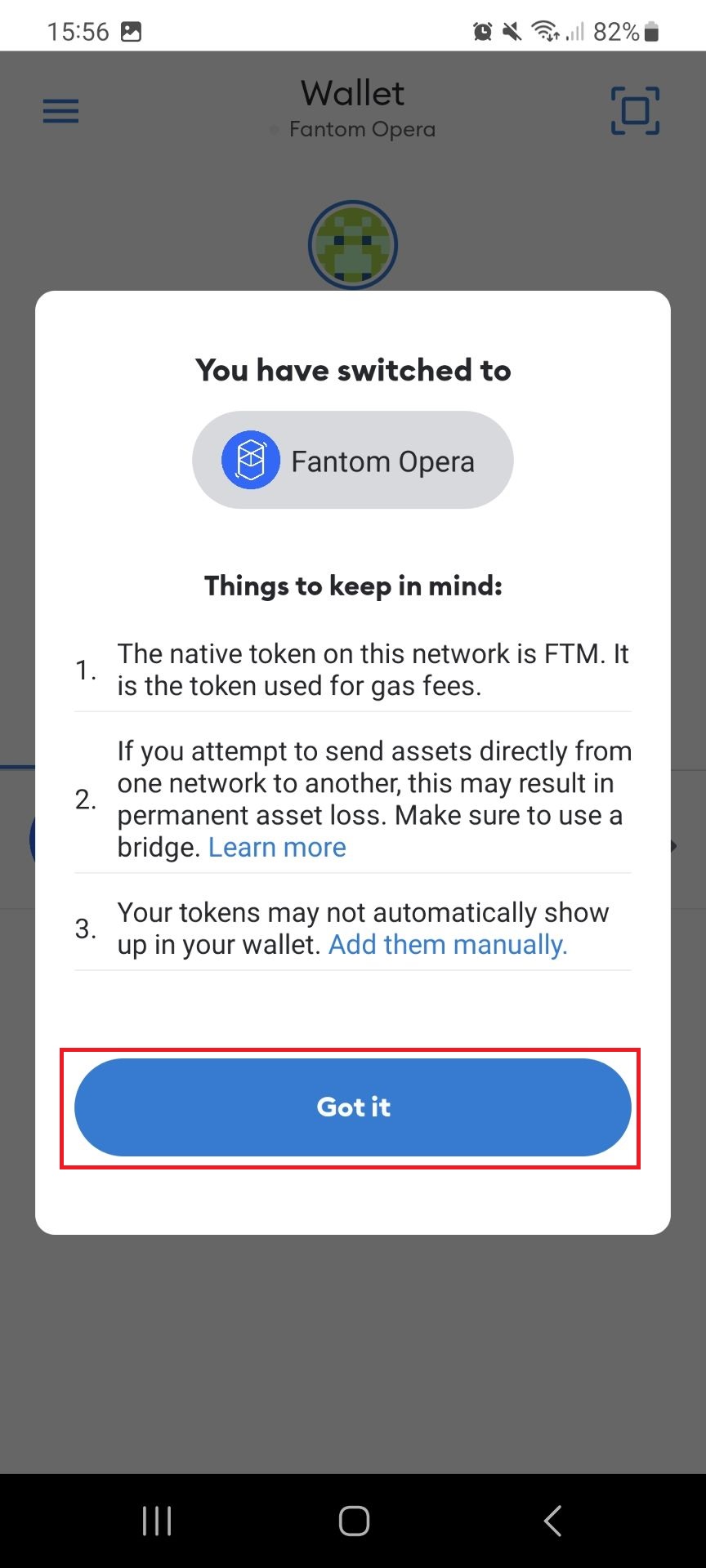 You may get a pop-up giving some general advice on the network, just as the native token and general security details. Click "Got it".