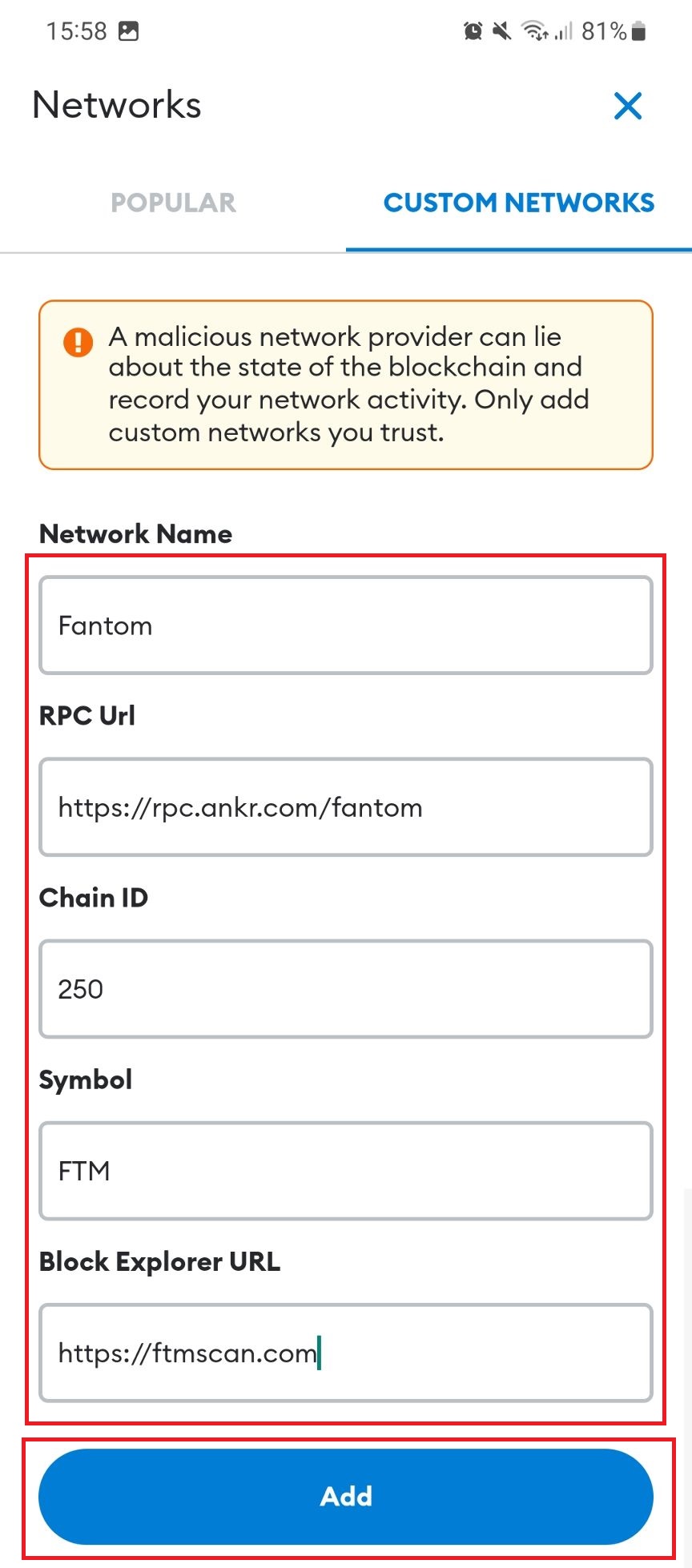 Also get these details from a reputable source. Here is an example of the settings for Fantom Opera taken from the Fantom foundation website. Click "Add"