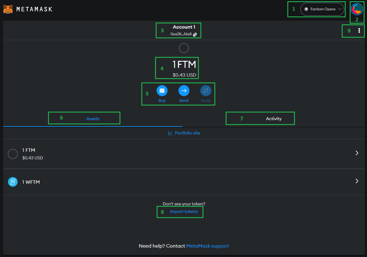 - ACTIVITY - Click here to show most recent activity done within the wallet. If you reset Metamask or interact elsewhere it wont show here but will on the blockchain explorer (point 9)