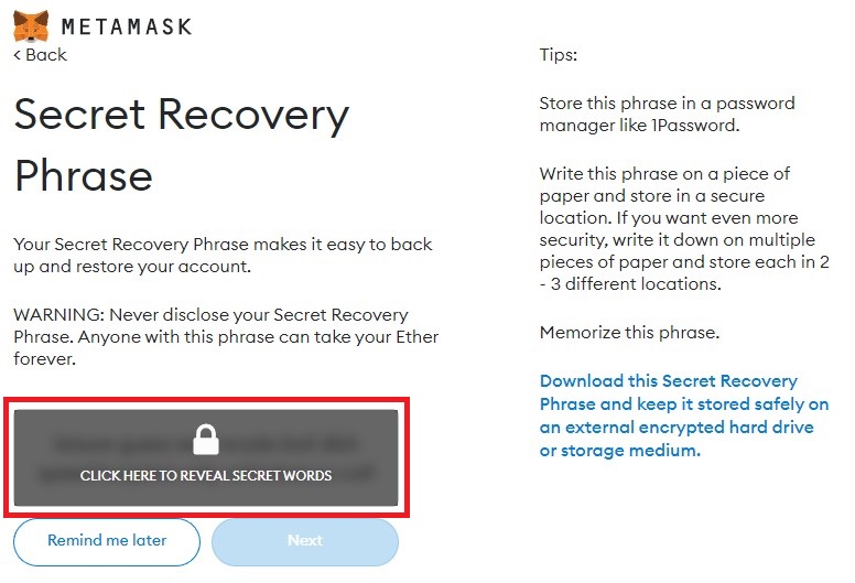 Click on the padlock to show your 12 secret words