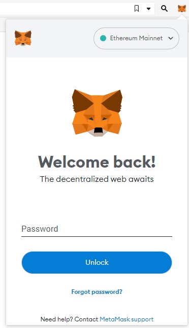 Clicking the MetaMask icon in the top right hand corner of the browser will prompt for your password from earlier