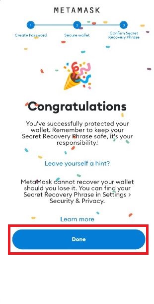Your wallet is now set up. Congratulations. Click 'Done"'