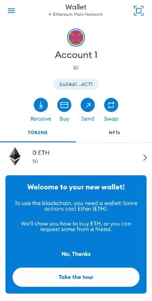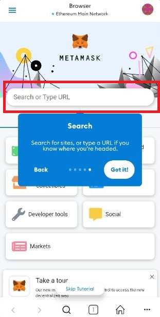 This is the MetaMask web browser. To use your wallet to interact with web3 sites you have to use this. You can either search or type the URL into the box. Any interactions with a blockchain will prompt metamask for you to authorise.Back to top