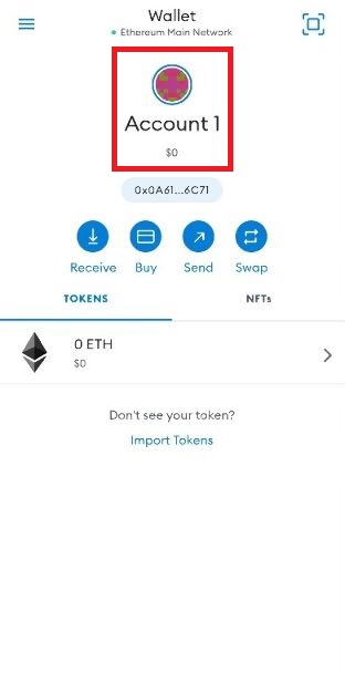 This shows the current account you are on and the balance of that account. One 'private key' can have multiple public address, each one a different account. So you can create multiple accounts using one 12 seed phrase and it will restore all the wallets associated. (See Learning). You can customise account names as you please buy long holding on the name. You can switch between accounts by clicking on the icon above the account name.