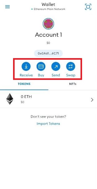 Receive - This gives you ways to share you address for receive funds from others Buy - Buy some tokens direct into your wallet using bank transfers or card.Send - Send tokens between your own wallets or to another.Swap - Only available on ETH. Swap tokens for one another.